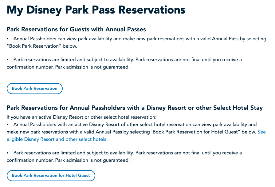 You can also modify a Park Pass reservation - although it specifically says Park Pass reservations made for hotel stays cannot be modified yet - and I do not see any of my existing Park Pass reservations on the page where you can modify them (here: https://disneyworld.disney.go.com/entry-reservation/ )